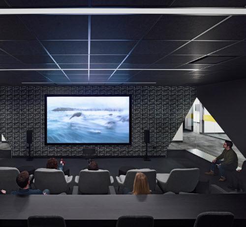 Rockfon® Cinema Black™ matte black acoustical stone wool ceiling tiles can be used to create a black ceiling to enhance the aesthetics of spaces like theaters and cinemas while providing excellent sound absorption, with an NRC up to 0.95. The sleek aesthetic is perfect for other tech-forward and performance spaces like auditoriums, sound studios, libraries and large meeting rooms.